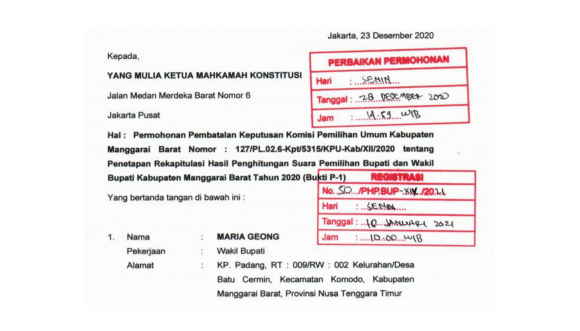 Pada hari ini Senin tanggal delapan belas bulan Januari tahun dua ribu dua puluh satu pukul 10:00 WIB, telah dicatat dalam Buku Registrasi Perkara Konstitusi Elektronik (e-BRPK) Permohonan Perselisihan Hasil Pemilihan Gubernur, Bupati, dan Walikota Tahun 2020, dengan registrasi perkara: NOMOR 50/PHP.BUP-XIX/2021, yang diajukan oleh: Drh. MARIA GEONG, Ph.D dan SILVERIUS SUKUR, SP Pasangan Calon Bupati dan Wakil Bupati Manggarai Barat Tahun 2020, Nomor Urut 2 . Dalam hal ini berdasarkan Surat Kuasa Khusus bertanggal 17 Desember 2020 memberi kuasa kepada ELEONARIUS DAWA, S.H. Selanjutnya disebut sebagai PEMOHON, Terhadap Komisi Pemilihan Umum Kabupaten Manggarai Barat Selanjutnya disebut sebagai TERMOHON;