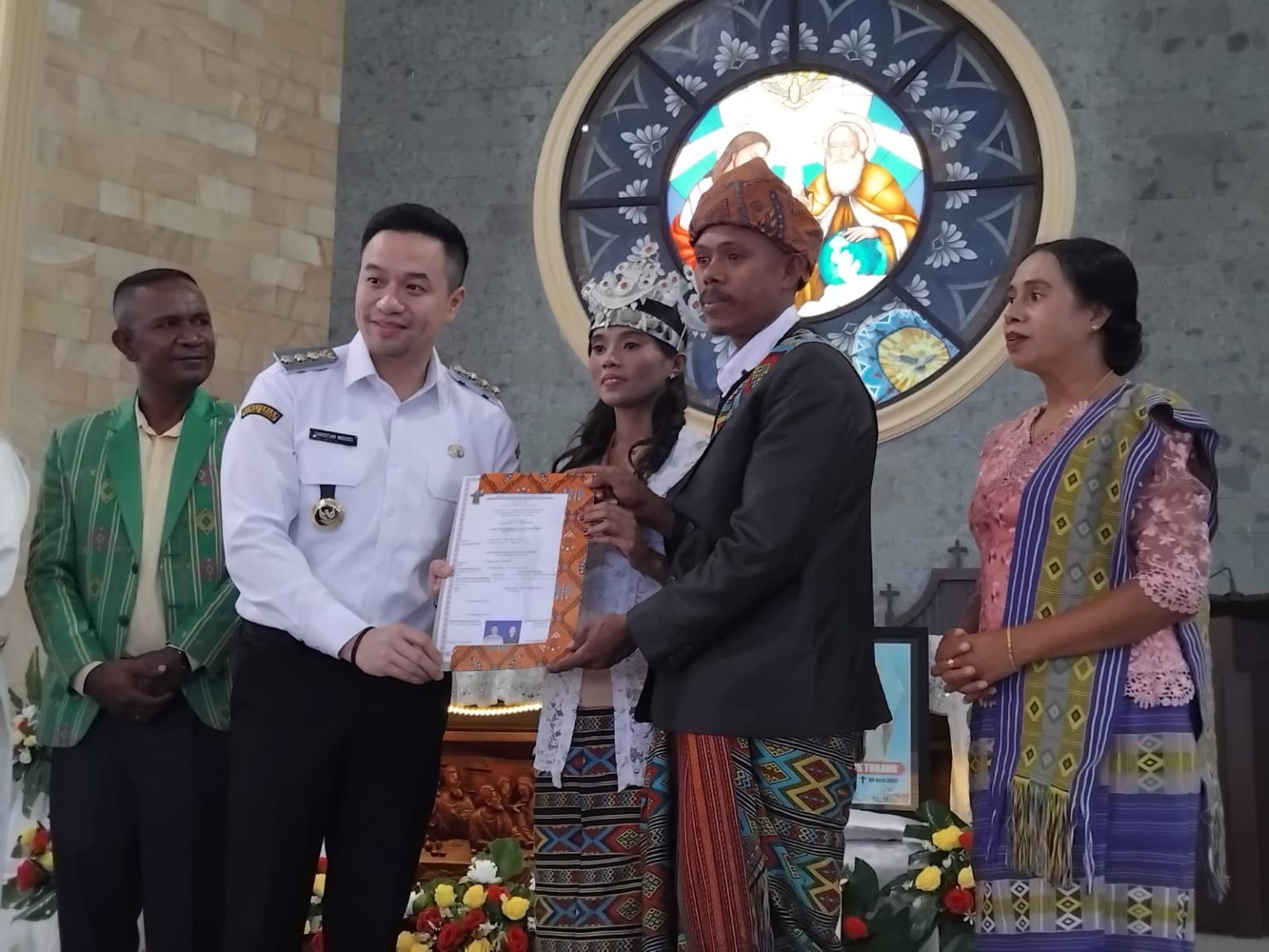Wali Kota Kupang Serahkan Akta Perkawinan secara Simbolis kepada Pasutri di Gereja Katolik St Fransiskus Asisi BTN Kolhua pada Rabu, 14 Mei 2025. (Foto Ama Beding)