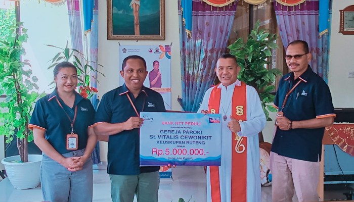 Ruteng, KN – Bank Pembangunan Daerah Nusa Tenggara Timur (Bank NTT) dalam mendukung kegiatan keagamaan dan sosial kembali ditunjukkan melalui bantuan kepada Gereja Katolik St. Vitalis Cewonikit. Bantuan berupa uang tunai sebesar Rp 5.000.000 diberikan untuk mendukung pembangunan aula serbaguna di paroki tersebut.