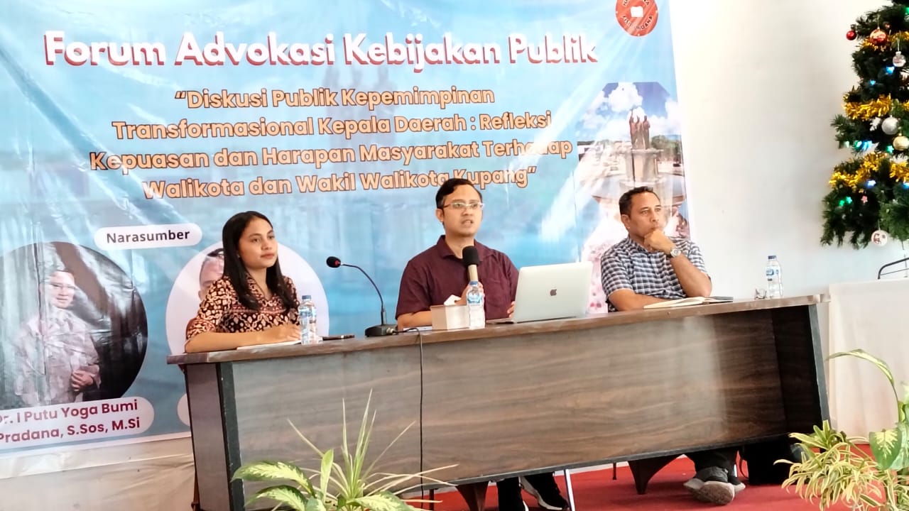 Diskusi publik tersebut menghadirkan dua narasumber, yakni Dr. I Putu Yoga Bumi Pradana dan Dr. Laurensius Sayirani, yang memaparkan hasil riset terkait tingkat kepuasan masyarakat terhadap kepemimpinan Wali Kota Kupang, dr. Christian Widodo, dan Wakil Wali Kota, Serena Francis.