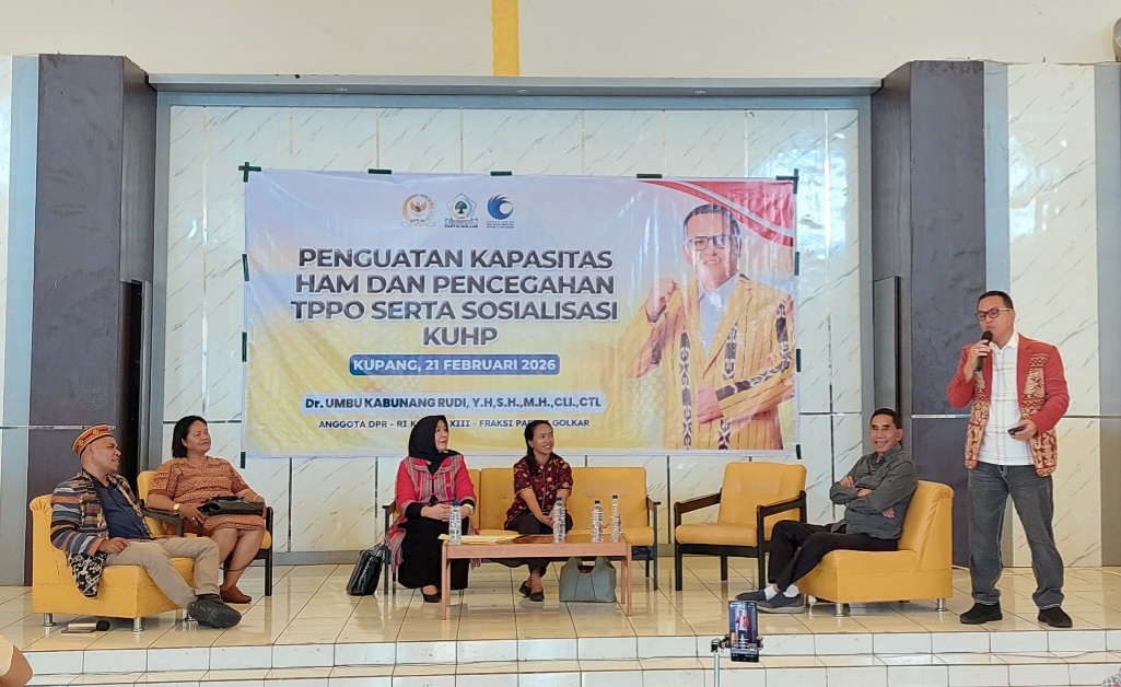 Kupang, KN – Anggota DPR RI Komisi XIII Dapil NTT II, Dr. Umbu Rudi Kabunang, menggelar kegiatan reses bertema penguatan kapasitas Hak Asasi Manusia (HAM) dan Tindak Pidana Perdagangan Orang (TPPO) serta sosialisasi Kitab Undang-Undang Hukum Pidana (KUHP), Sabtu (21/2/2026).