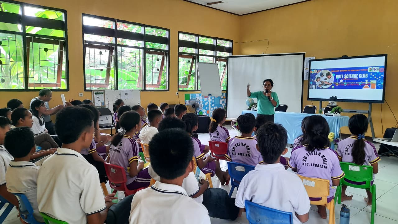 Alumni LPDP, Aplonia Adriana Mozes saat mengajar dalam kegiatan Rote Science Club Perdana pada Januari 2026 yang membahas Energi terbarukan di SD Tefila Rote Ndao. (Foto: DOKUMEN PRIBADI)