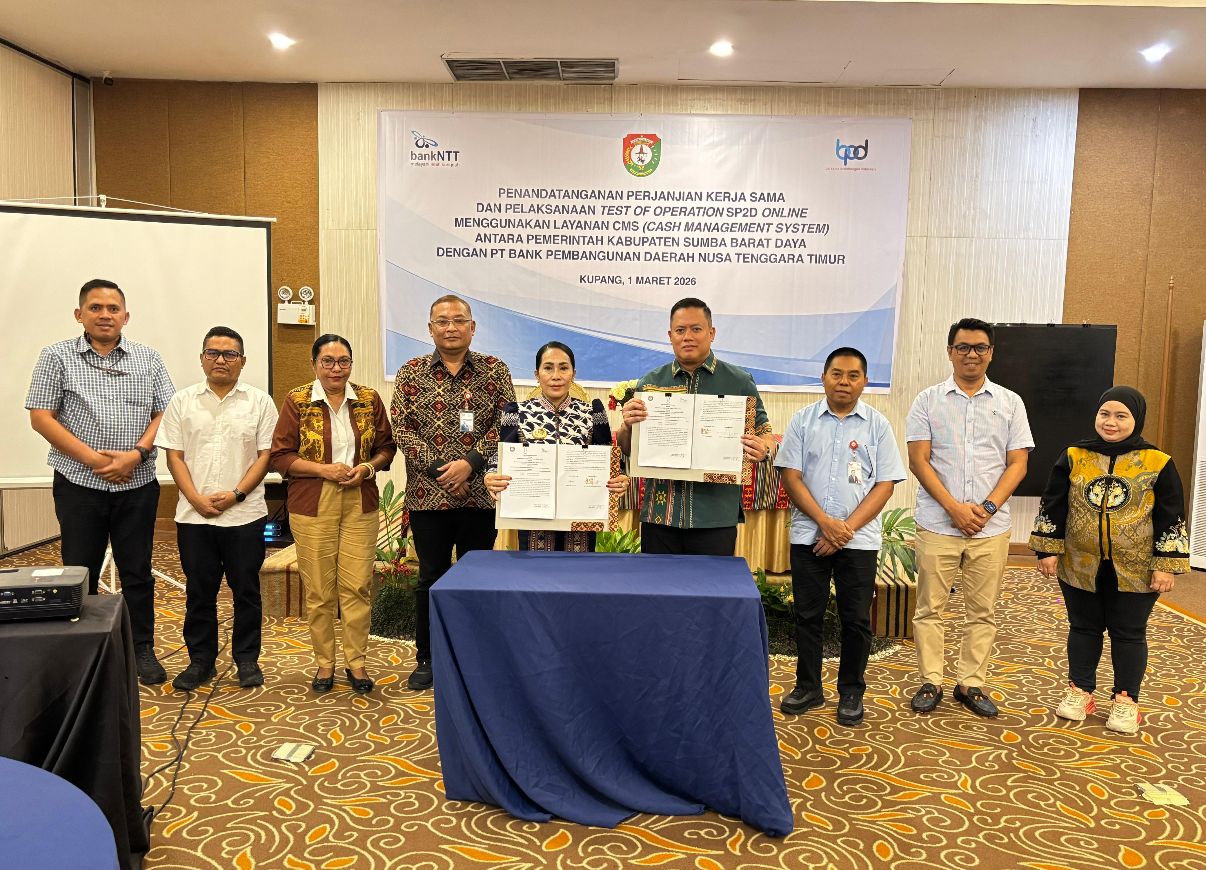 Kupang, KN — Bank NTT bersama Pemerintah Kabupaten Sumba Barat Daya resmi menandatangani Perjanjian Kerja Sama dan melaksanakan test of operation SP2D Online menggunakan layanan Cash Management System (CMS).
